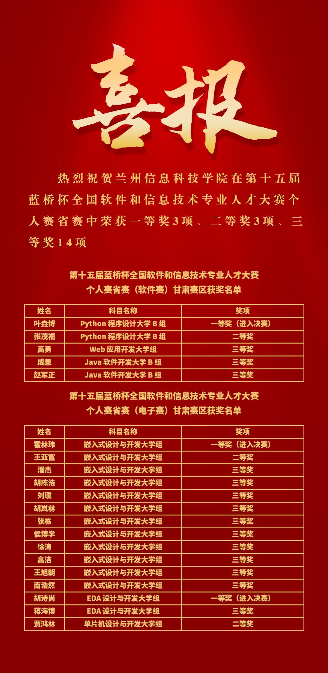 近日,由工业和信息化部人才交流中心主办的第十五届“蓝桥杯”全国软件和信息技术专业人才大赛个人赛省赛甘肃赛区获奖名单公布,beat365官网唯一入口学子经过激烈角逐,荣获省一等奖3项,二等奖3项,三等奖14项,其中计算机与人工智能学院叶垚博等3名学生凭借出色的表现,在省赛中脱颖而出,荣获一等奖,并成功晋级参加国赛。