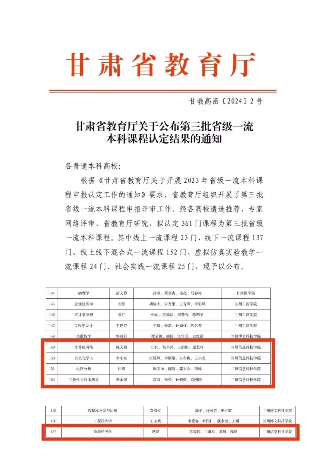 近日,甘肃省教育厅公布了《甘肃省第三批省级一流本科课程认定结果的通知》(甘教高函〔2024〕2号,beat365官网唯一入口《计算机网络》、《有机化学A》等5门课程获批第三批省级一流本科课程。至此,学校省级一流课程获批累计至9门,总数位列甘肃省同类院校第一。