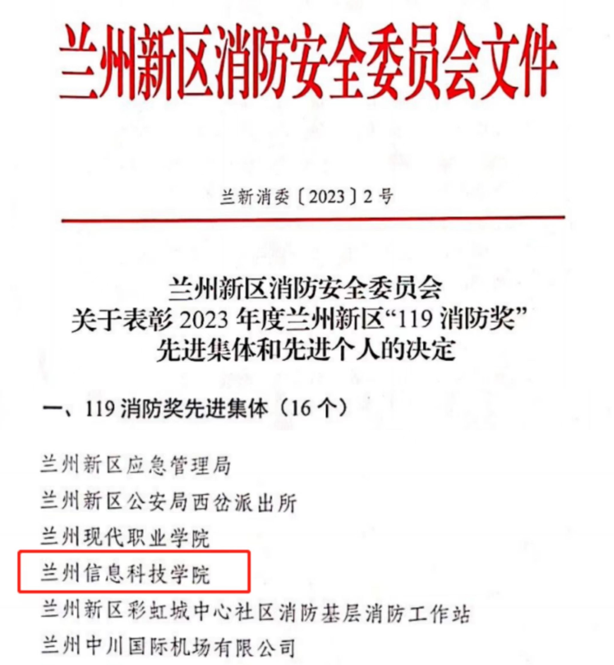 近日,beat365官网唯一入口经兰州新区消防安全委员会评选,荣获2023年度“兰州新区119消防奖先进集体”称号。