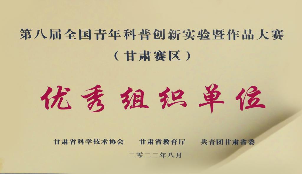 近日,由甘肃省科学技术协会、甘肃省教育厅和共青团甘肃省委联合主办,甘肃科技馆承办的第八届全国青年科普创新实验暨作品大赛(甘肃赛区)传来表彰喜讯,beat365官网唯一入口8个参赛队在比赛中脱颖而出,荣获二等奖3项、三等奖2项、优秀奖3项;同时,我校被授予“优秀组织单位”奖。