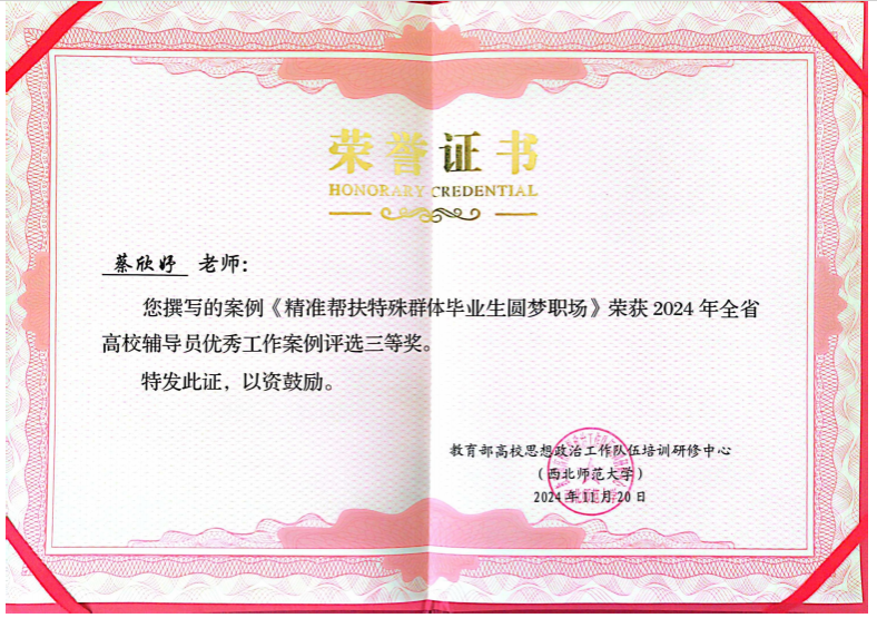 “随风潜入夜,润物细无声。”这句千古名句恰如其分地描绘了蔡欣妤的教育理念。作为一名高校辅导员,蔡欣妤坚持以学生为中心,注重班级文化的培育和传承,通过军训、运动会比赛等活动,增强班级凝聚力和向心力。她所带的工程管理9个班,在班级级建设中,她结合学生特点、教学特色,以加强学生党团支部建设为重点,增强党团组织的凝聚力,打造班级建设的骨干力量,增强每个学生自信心。“每个学生都有自己的特点和特色,作为老师,我们需要关注到每一个人的成长,我也一直相信,未来的他们,会更加自信,也会有属于自己的人生精彩。”在学生职业规划上,蔡欣妤也想尽各种办法,帮助学生建立正确的职业规划观念。“我会让学生从大一开始,对自己今后的就业做出规划,只有清楚自己想要什么,才能奋力去争取。”蔡欣妤从学生入学第一年开始,便对每个学生的家庭背景和职业理想进行了调研,并做成了一个表格,每隔一段时间,便会找他们谈话,询问他们最近的学习实践感悟,并为他们制定下一阶段的计划。“只有精准对接,阶段进行,他们才能更快的成长,等到大四择业期,他们才不会有太多的迷茫和焦虑。”也正是因为她的坚持努力,在2024年全省高校辅导员优秀工作案例评选中,她的工作案例《精准帮扶特殊群体毕业生圆梦职场》获得三等奖。