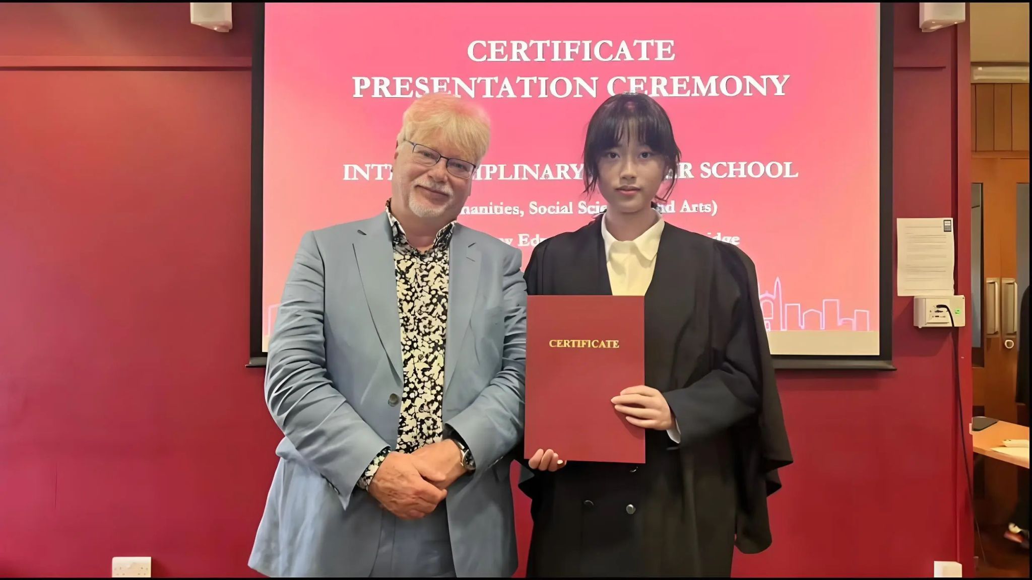 剑桥河畔,水面如镜,波光粼粼中,几只天鹅悠然自得地游弋,为这静谧的早晨添上了一抹生动与和谐。在带队老师的引领下,杨佳怡漫步在这座充满着深厚文化底蕴的世界名校--剑桥大学,开始了为期两周的研学之旅。“这是我‘蓄谋已久’的计划。”杨佳怡笑着说道。在国际英才班的英语学习,为她打开了更广阔的大门。当老师说有去剑桥大学研学的机会时,她毫不犹豫的报名参加,并顺利拿到了去剑桥研学的名额,正式向她的理想奔赴。“这是徐志摩笔下的剑桥,来到这里,不仅感受到了中国一代诗人的情愫,中西文化的碰撞,更让我感受都了知识带来的魅力。”从古老的桥梁到学术殿堂的传奇,剑桥的每一个故事都足有让前来求学的学子们动容。杨佳怡说,在剑桥上课时,让她深入了解到了英国历史文化和传统习俗,感受到了剑桥的文化魅力。在人文参访以及文化体验时,拓宽了她的眼界,让她收获了心灵的滋养。”参与此次研学活动,与来自不同学校的伙伴交流,我拓宽了人际关系网络,结识了很多优秀的人。”