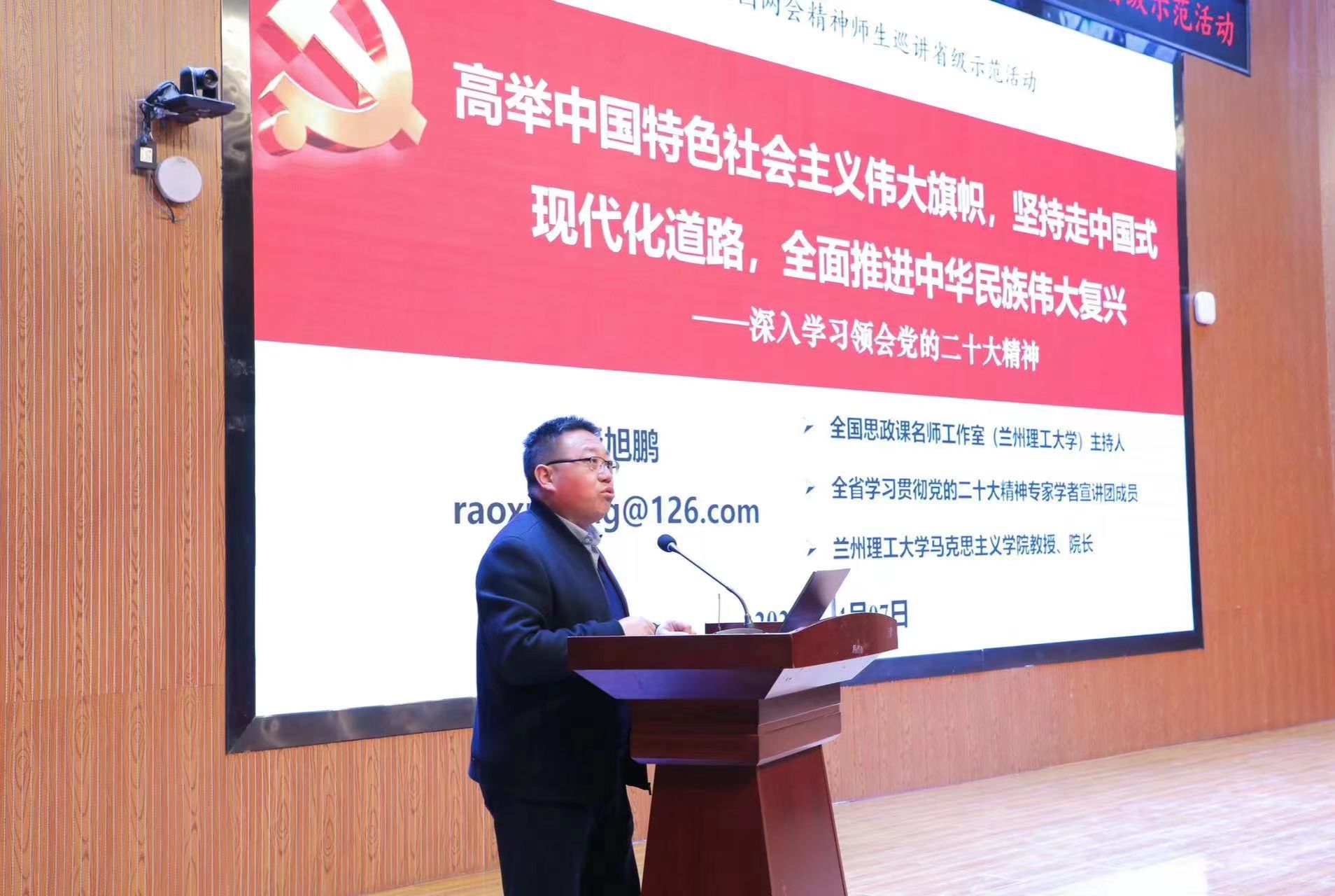巡讲会上,省级示范活动师生第四巡讲团组长兰州理工大学马克思主义学院院长、教授饶旭鹏,成员兰州理工大学经管学院辅导员贾永胜、兰州理工大学土木工程学院学生张莹博分别作《高举中国特色社会主义伟大旗帜,坚持走中国式现代化道路,全面推进中华民族伟大复兴——深入学习领会党的二十大精神》《奋进新征程,青春正当时》《永远跟党走,建功新时代》主题宣讲,采取“理论+故事”的形式,深入解读党的二十大的重大意义、丰富内涵和精神实质,把“大主题”切换成可理解的“小场景”,把“大道理”转化为通俗易懂的“小故事”,引导广大青年学生把青春奋斗融入党和人民的事业,学党史、强信念,跟党走,做有理想、敢担当、能吃苦、肯奋斗的新时代好青年。