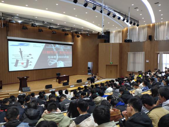 11月15日下午14:00兰州新区禁毒办教导员王道文警官开展“珍爱生命,拒绝毒品”为主题的校园禁毒普法知识讲座。在讲座中,王警官利用多媒体演示以及真实的案例分析,对什么是毒品、毒品的种类、毒品的危害、大学生如何远离毒品、如何识别毒品等内容分别做了讲解。目的是为了让学生充分了解毒品危害及禁毒方面的知识,进一步增强了同学们“珍爱生命,远离毒品”的意识。王警官结合自己禁毒工作的经历,形象生动的讲解了毒品所产生的危害,同学们听完纷纷表示:“毒品危害真不少,要与毒品划清界限。”讲座结束后,同学们认识到拥有健康心理、树立正确人生观、道德观的重要性,同时进一步提高了师生们的防毒、拒毒意识,为学生的终身健康发展奠定良好的基础。此次讲座不仅为我校学生身心健康的发展产生了积极的作用,同时提高了同学们的禁毒意识和拒绝毒品的自控能力。