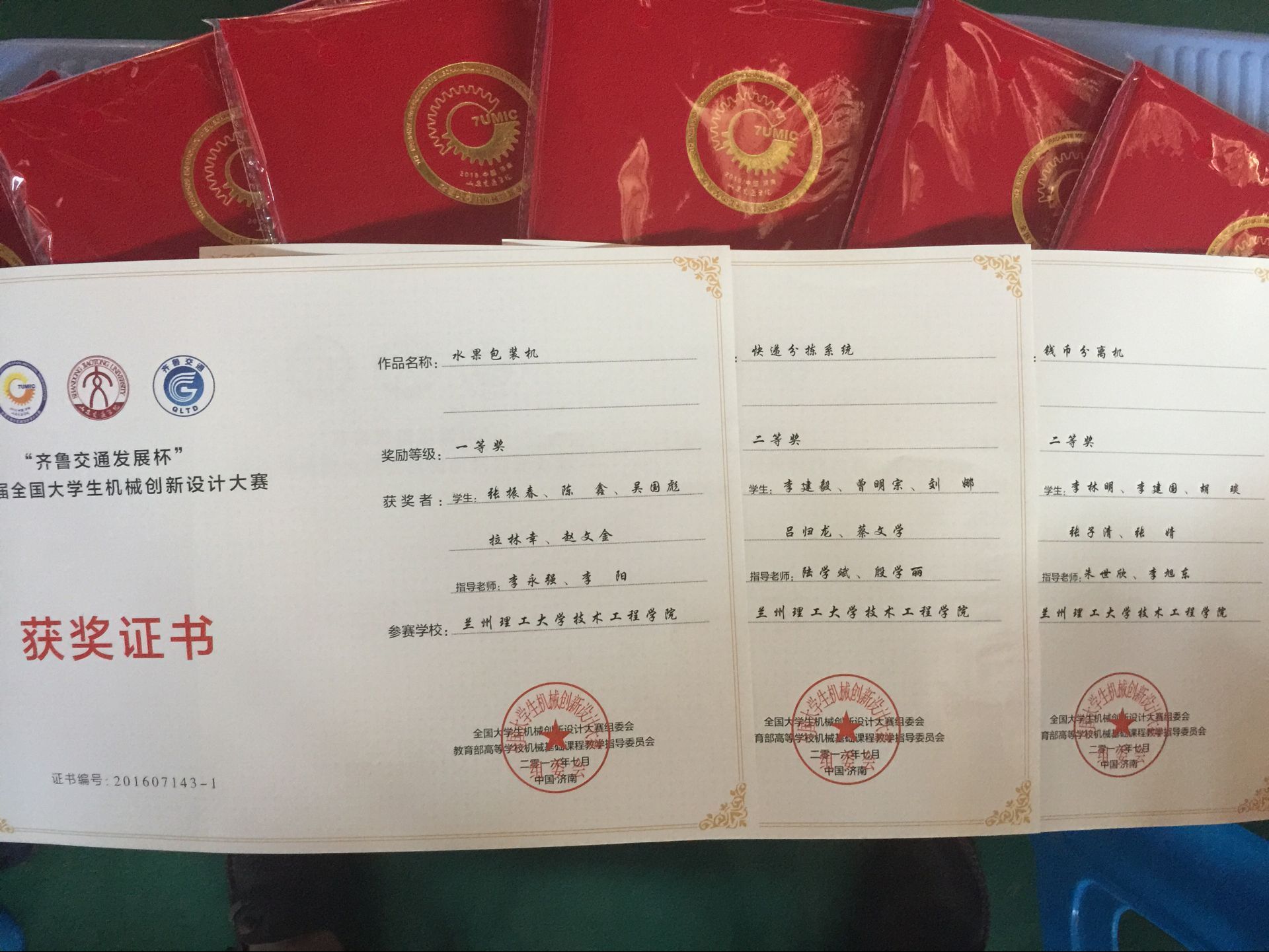 2016年7月29日,第七届全国大学生机械创新设计大赛在山东交通学院闭幕。大赛每两年举办一次,已经成为培养学生工程实践能力、创新设计能力和综合素质效果显著的颇具影响力的大学生竞赛项目。在此次竞赛中,我院共计报送四件作品参赛,其中在甘肃赛区竞赛中,三件作品获得特等奖,一件作品获得二等奖,三件特等奖作品代表甘肃参加了此次全国决赛。最终,由2013级机械设计制造4班张振春等五名同学制作的“水果包装机”荣获本次大赛全国一等奖,由2013级电气工程及其自动化1班李林明等五名同学制作的“钱币分离机”和2014级物联网工程1班李建毅等五名同学制作的“快递分拣系统”荣获本次大赛全国二等奖。