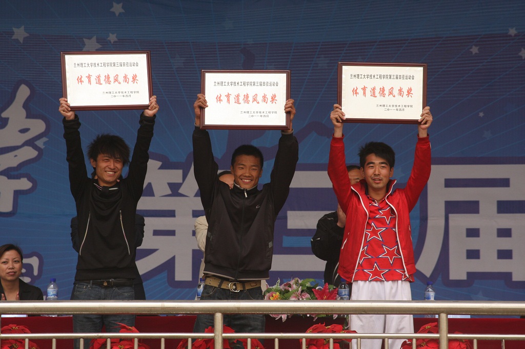 在运动员、裁判员入场后,学院院长助理兼财务处处长谭蓉、人文体育部主任赵迎新、教务处处长任宗义和党委书记、副院长李骐分别宣读了“关于表彰技术工程学院2011年教职工羽毛球比赛获奖个人的决定”、“关于表彰学院第三届田径运动会啦啦操比赛获奖集体的决定”、“关于表彰学院第三届田径运动会‘优秀运动员’、‘优秀裁判员’、‘优秀工作人员’的决定”和“关于表彰学院第三届田径运动会‘体育道德风尚奖’获奖集体的决定”。总裁判长刘曼冬宣读了本次运动会各项比赛成绩。各位领导为各位获奖运动员和集体颁奖。