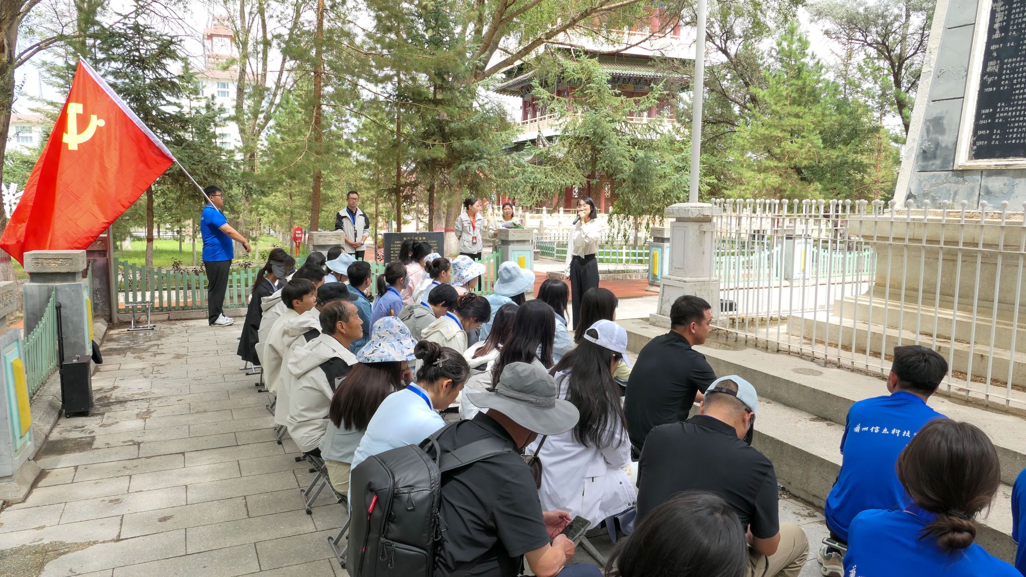 午后,师生们踏上红色实践教学之旅。在孙建初纪念碑前,郑璇老师动情讲述“中国石油之父”踏遍祁连、为国寻油的传奇人生;梁洁老师通过纪念馆的珍贵史料,将科技报国的赤子情怀娓娓道来。老一井旁,李颖老师带领学员“重走铁人路”,李樱桃老师以互动教学点燃“工业报国”的传承之火;古朴的老君庙下,孙玉娇老师解密石油开采与庙宇的百年渊源;玉门解放门前,马红秀老师以鲜活的英雄史诗,再现这座城市的光荣记忆。