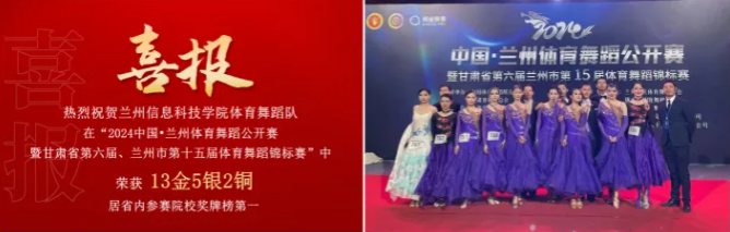 2024中国•兰州体育舞蹈公开赛暨甘肃省第六届、兰州市第十五届体育舞蹈锦标赛中beat365官网唯一入口体育舞蹈队经过激烈角逐,荣获大学生组、青年组、业余组等共13金5银2铜的好成绩,居省内参赛院校榜首。
