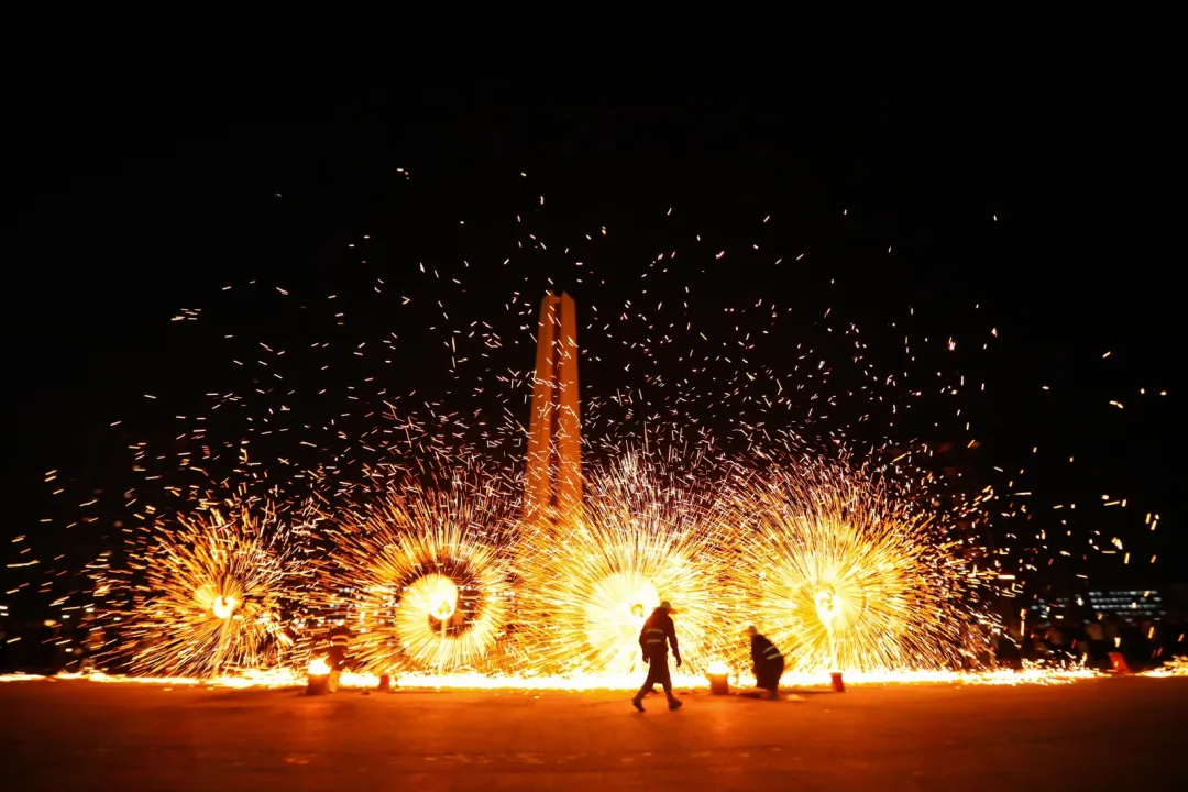 随后,炽热的铁水在匠人们的巧手下,化作漫天飞舞的金色花雨,宛如繁星坠落,又似火龙腾空。铁花在空中绽放的瞬间,照亮了每一位观众的脸庞,也照亮了他们对新学期的期待。