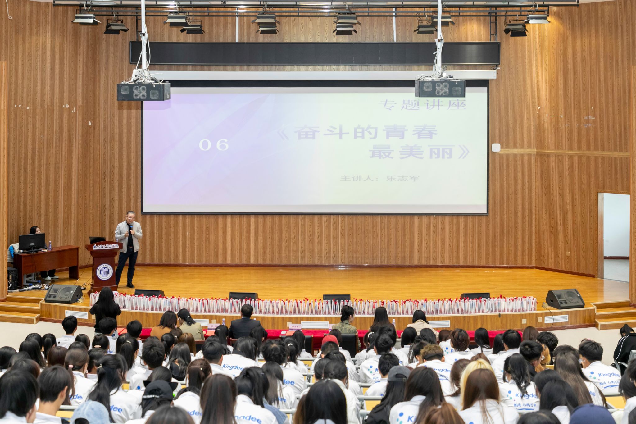 仪式结束后,乐志军作为主讲嘉宾带来了“奋斗的青春最美丽”专题讲座。他结合自身的学习和工作经历,为学生们讲述了在新时代背景下如何追求个人成长与职业发展。作为毕业于华东理工大学和中山大学管理学院IMBA的管理学硕士,以及中南大学和山西财经大学的特聘指导教师,乐志军先生以其丰富的经验和深刻的见解激励学生树立奋斗目标,探索更广阔的未来。