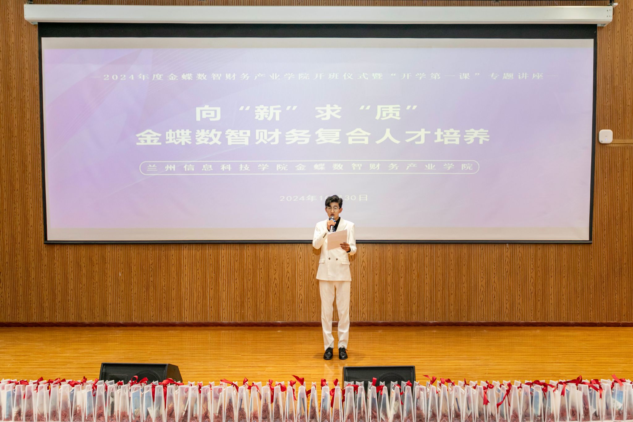 2024级财务管理专业(数智财务方向)新生代表马玉琪同学分享了她对未来学习的期待和对进入金蝶数智财务产业学院的自豪感。她表示,将珍惜在学院学习的每一刻,奋力前行,不负韶华,立志成为一名优秀的财务专业人才。
