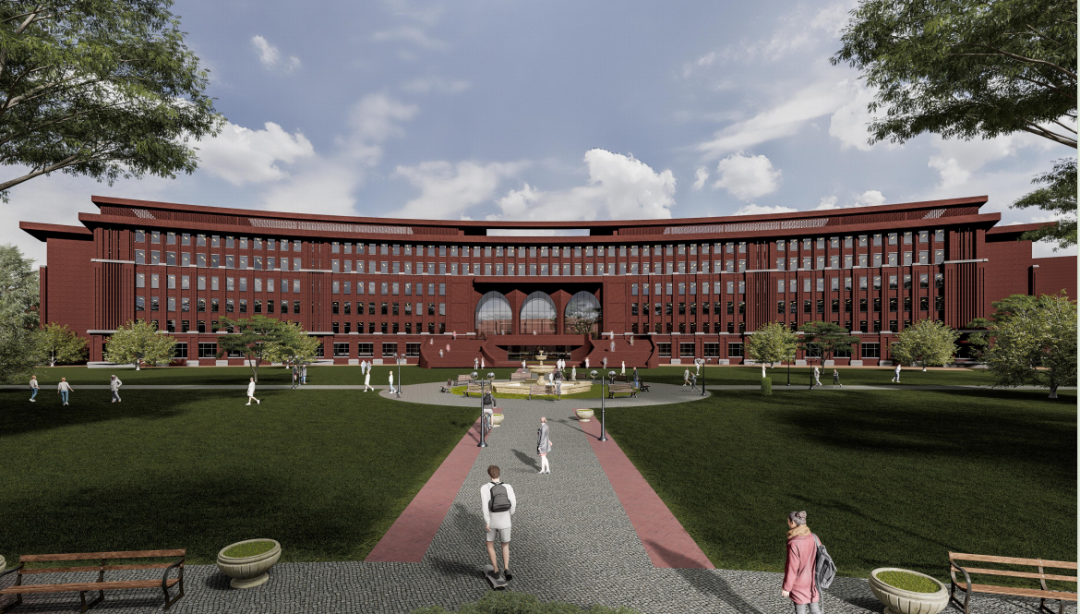据悉,新教学楼命名为“智慧之树”,位于二期核心位置,地上6层,整体结构采用弧形框架结构,总建筑面积20868平方米,可同时容纳万名学生上课。建筑风格保持一期校园建设风格,并进行了延续设计,风格端庄、大气而又不失活泼,整体规划了功能区、互动区、休闲区三大区域,给师生拓展了更广阔的学习活动空间。该项目施工包含土方、桩基础、隔震支座、主体结构工程、水电安装工程、室内装修工程、室外配套工程、外立面工程等,整体计划2024年7月30日竣工交付,2024年秋季学期投入使用。