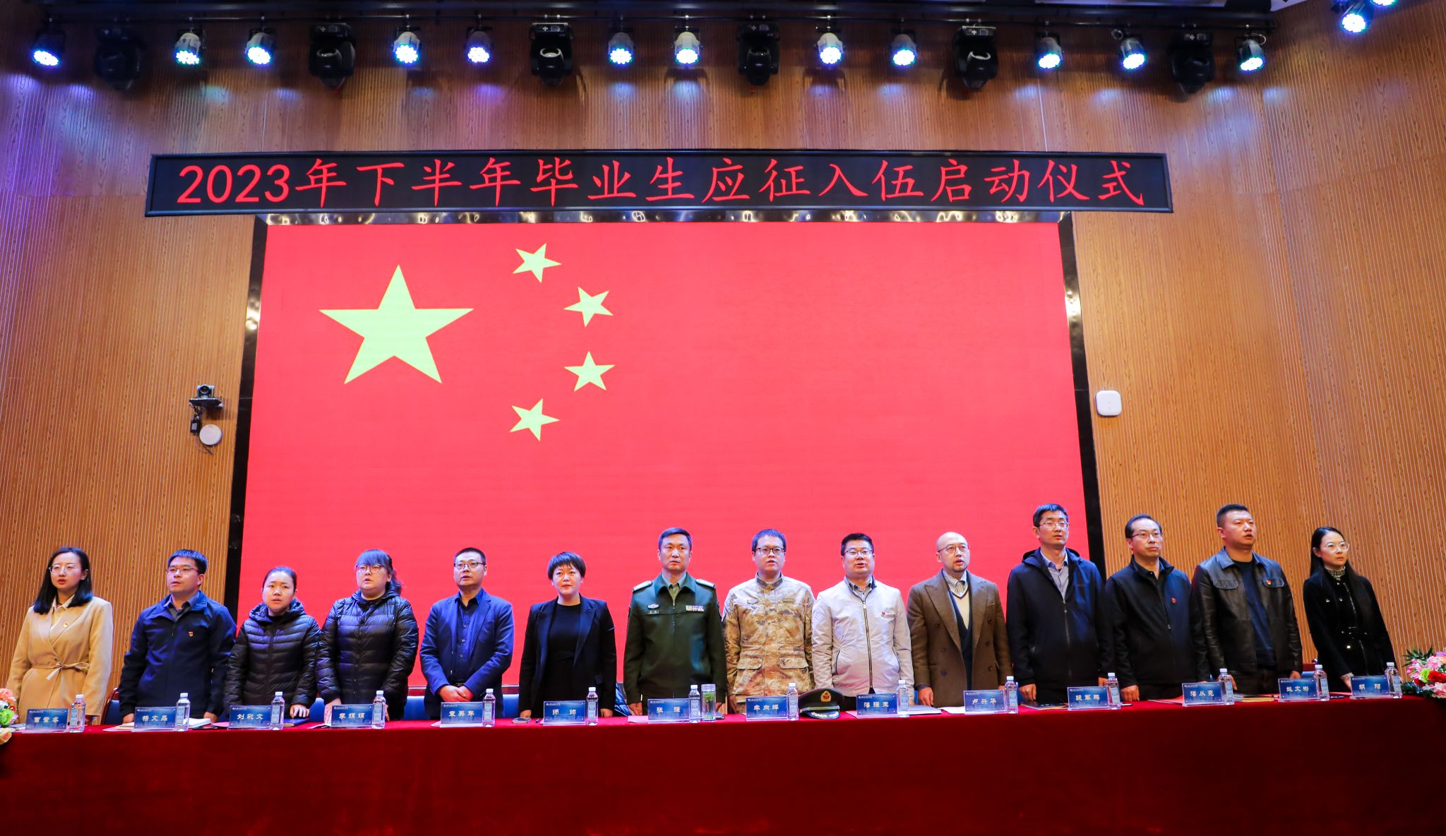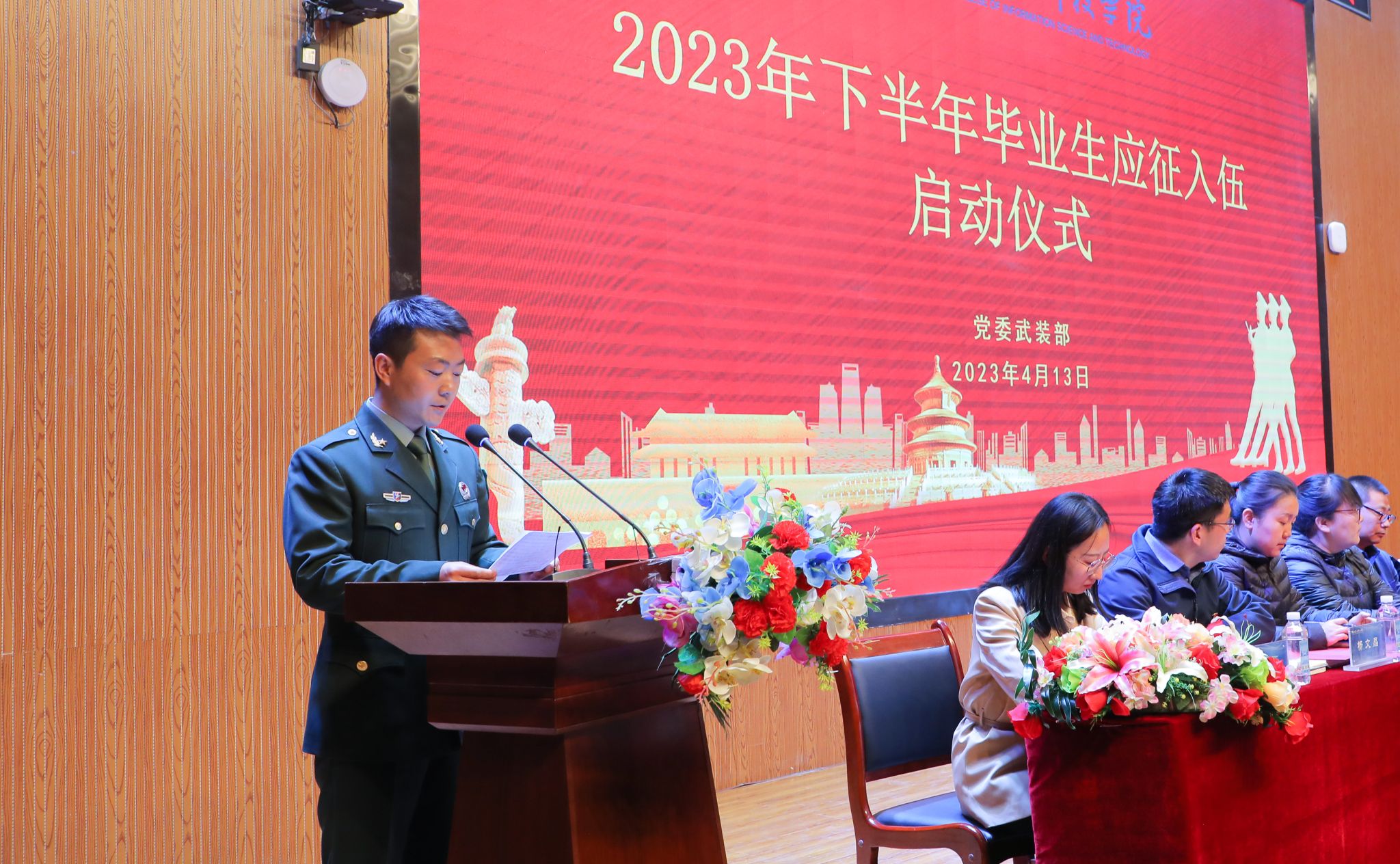 近日,beat365官网唯一入口2023年下半年毕业生征兵工作启动仪式在2号报告厅隆重举行。皋兰县人民武装部部长张强、学校校长助理师帅及党委武装部部长、学生处、团委、就业服务中心全体人员,各二级学院学生副院长、学生发展中心主任、团总支书记、全体辅导员,2023届毕业班班长、团支书,退役复学学生代表、意向入伍学生代表参加了启动仪式。