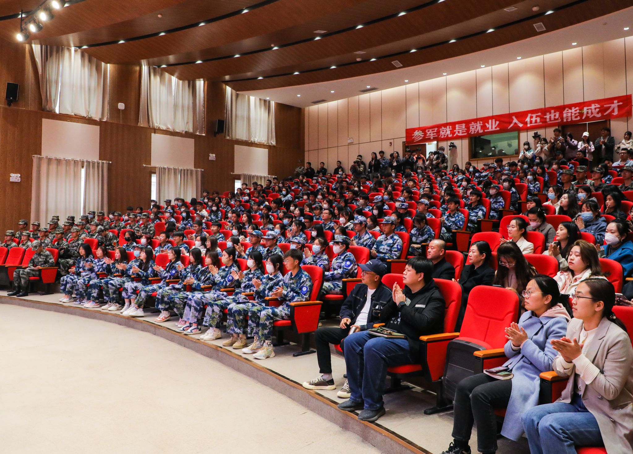 张强部长从国防教育、军事理论教育、爱国主义教育、历史文化教育四个方面进行了宣讲,他指出:“面对如今复杂的国际形势,我军新式装备的不断更新,军队急需高质量人才,而大学生就是军队高质量人才的最优人选”。他强调:“大学生应当积极响应国家号召,投身于火热的军营当中,充分展现出当代青年大学生的责任和担当”。