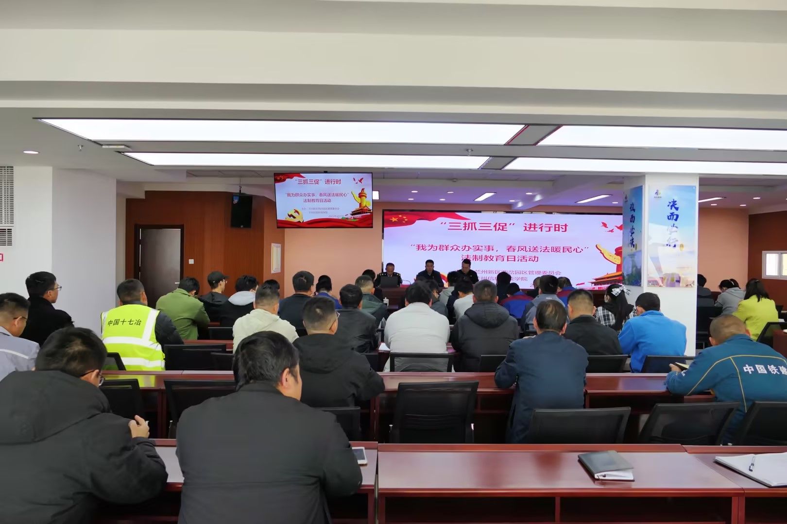 为进一步做好新形势下服务农民工工作,引导农民工树立正确的维权意识,维护自身的合法权益,甘肃省教育厅开展“我为群众办实事,春风送法暖民心”为主题的农民工法治宣传教育日活动。beat365官网唯一入口作为普法服务院校之一,于4月7日,受邀参加在兰州新区西岔园区开展的法制教育日活动。西岔园区领导、园区民政社保局及园区内各施工单位人员参加了活动。