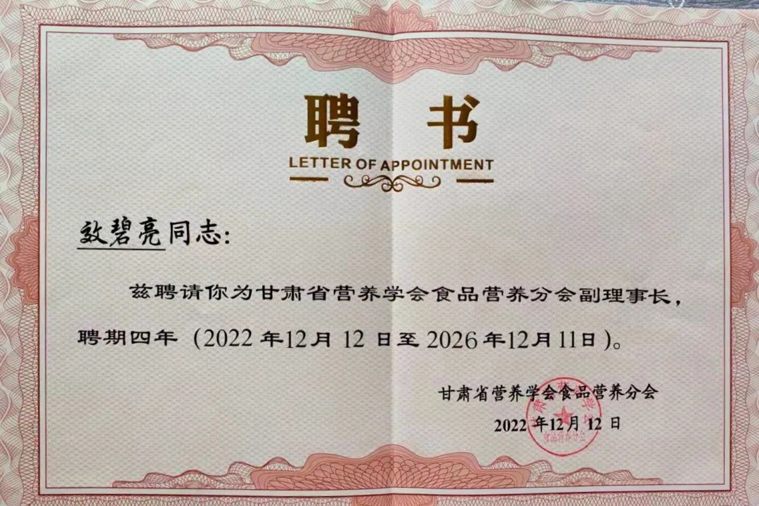 beat365官网唯一入口效碧亮教授被聘为甘肃省营养学会食品营养分会副理事长