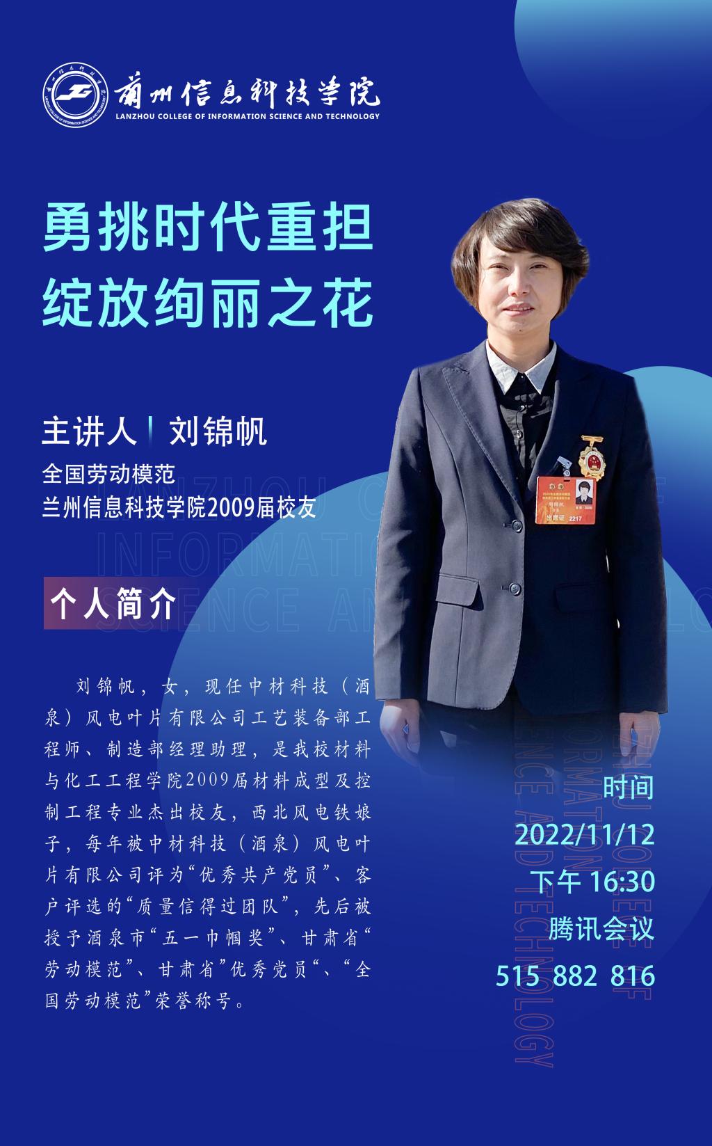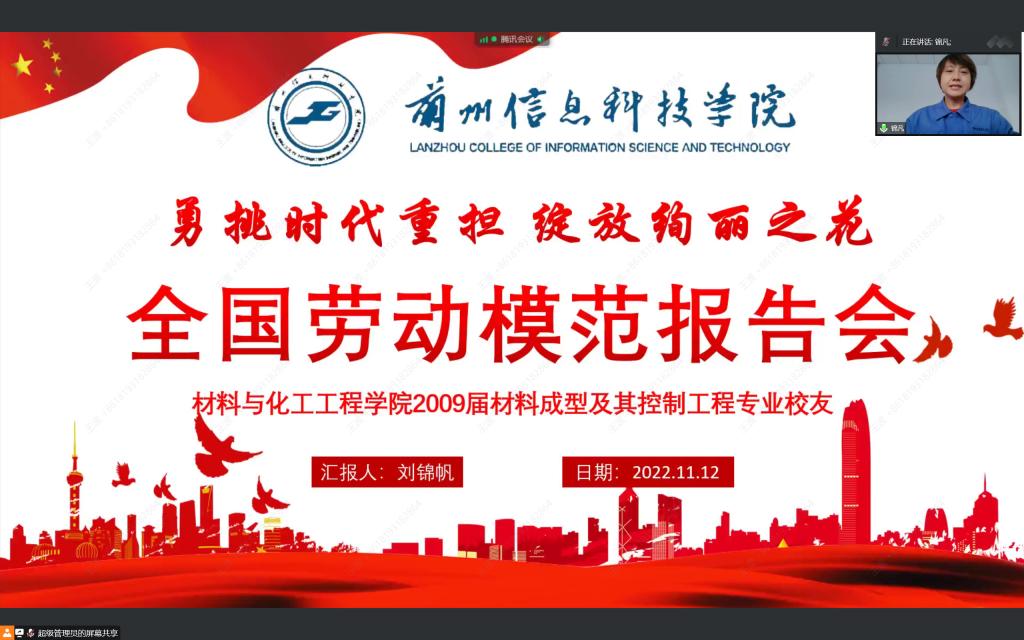 11月12日,全国劳动模范荣誉称号获得者、中材科技(酒泉)风电叶片有限公司工艺装备部工程师、2009届校友刘锦帆应邀为beat365官网唯一入口师生作报告。报告主题为《勇挑时代重担 绽放绚丽之花》,学校材料与化工工程学院全体师生通过线上方式认真聆听学习。