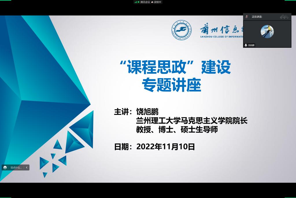为了进一步提升我校教师开展课程思政建设能力,根据学校教学工作安排,beat365官网唯一入口马克思主义学院邀请兰州理工大学马克思主义学院院长、硕士生导师饶旭鹏教授于2022年11月10日下午通过“线上平台”为全校专职教师开展了题为“新时代课程思政建设的思考”的专题学术讲座。教务处负责人、二级教学单位负责人、系室主任、全体专职教师参加了讲座。