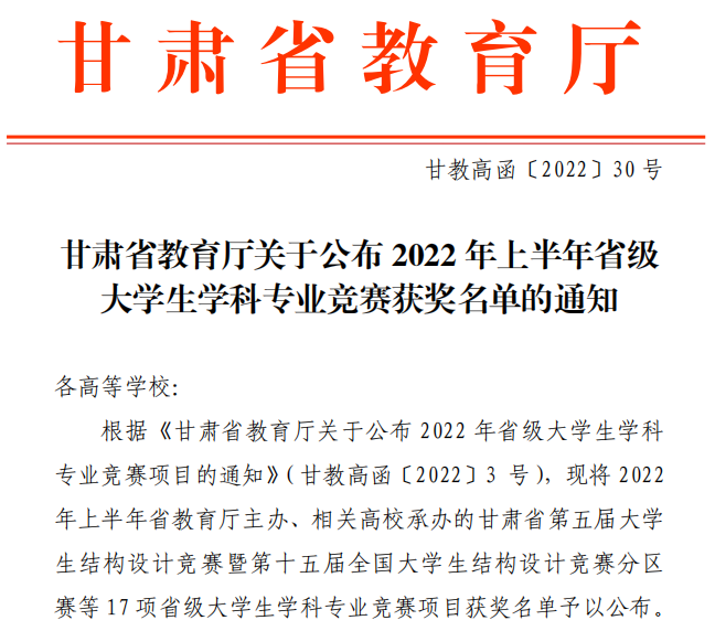 近日,甘肃省教育厅公布 2022 年上半年大学生学科专业竞赛获奖名单,由甘肃省教育厅主办的甘肃省第五届大学生结构设计竞赛暨第十五届全国大学生结构设计竞赛分区赛等17项大学生学科专业竞赛项目落下帷幕。beat365官网唯一入口共计获奖97项,10位老师被授予“优秀指导教师”荣誉称号,获奖数量超过全省同类院校获奖总数的50%以上。