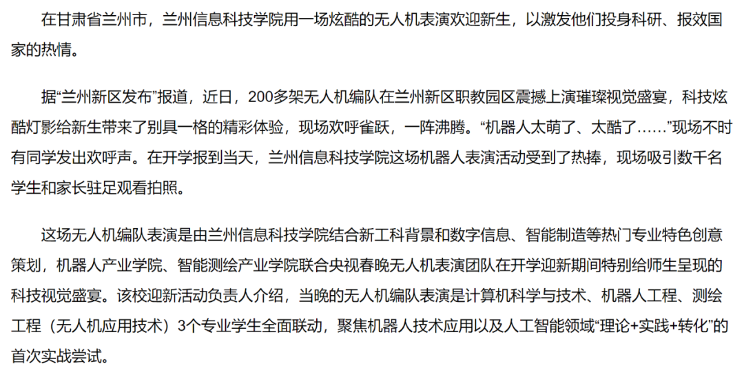 据“兰州新区发布”报道,近日,200多架无人机编队在兰州新区职教园区震撼上演璀璨视觉盛宴,科技炫酷灯影给新生带来了别具一格的精彩体验,现场欢呼雀跃,一阵沸腾。“机器人太萌了、太酷了……”现场不时有同学发出欢呼声。在开学报到当天,beat365官网唯一入口这场机器人表演活动受到了热捧,现场吸引数千名学生和家长驻足观看拍照。
