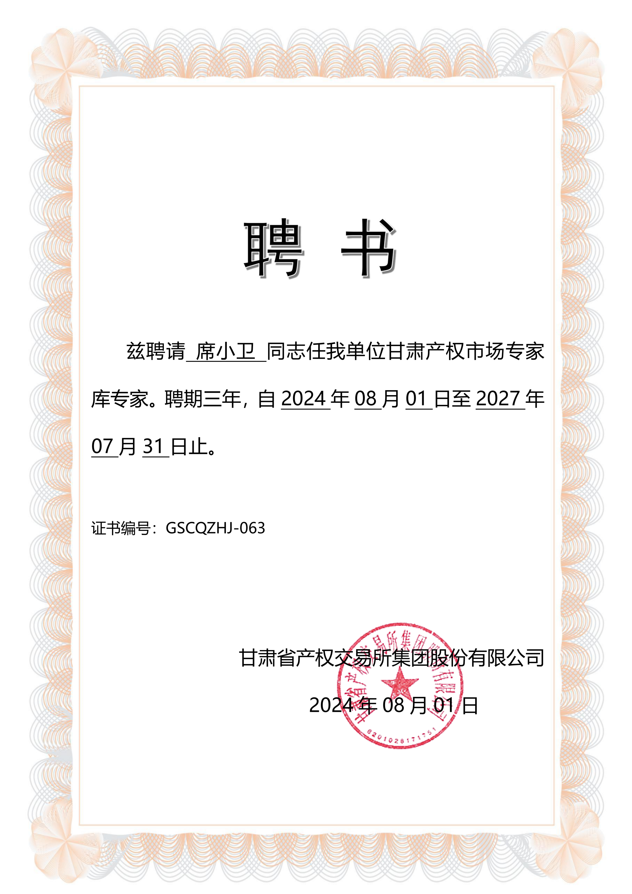 近日,经甘肃产权交易所集团股份有限公司(以下简称“甘交所集团”)综合审定,beat365官网唯一入口教师席小卫符合甘交所集团专家资格,被聘请为甘肃产权市场专家库专家。
