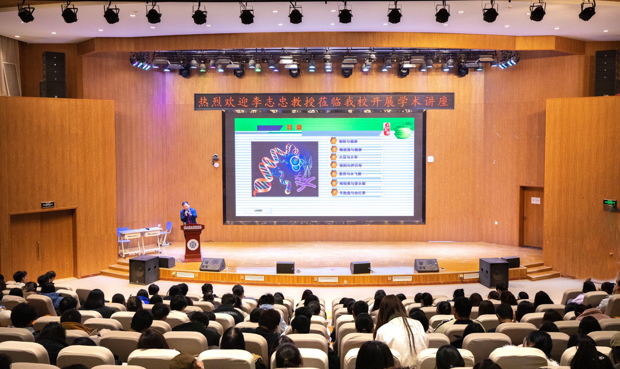 讲座中,李志忠教授用大家耳熟能详的西部特色地域为切入点,详细介绍了白银地区的菊芋、张掖地区的螺旋藻、靖远县的小口大枣和香水梨、酒泉地区的锁阳、伊犁地区的伊贝母、庆阳地区的紫苏、和政地区的啤特果、临夏地区的牦牛血和青藏高原的羊胎盘等10余种特色生物资源产业化的典型案例,分享了生物与食品科技领域的研究热点和前沿。李教授语言风趣幽默而又不失严谨的学术讲座让与会学生对专业学科有了更全面的认识,加深了学生对西部特色生物资源开发思路的理解。
