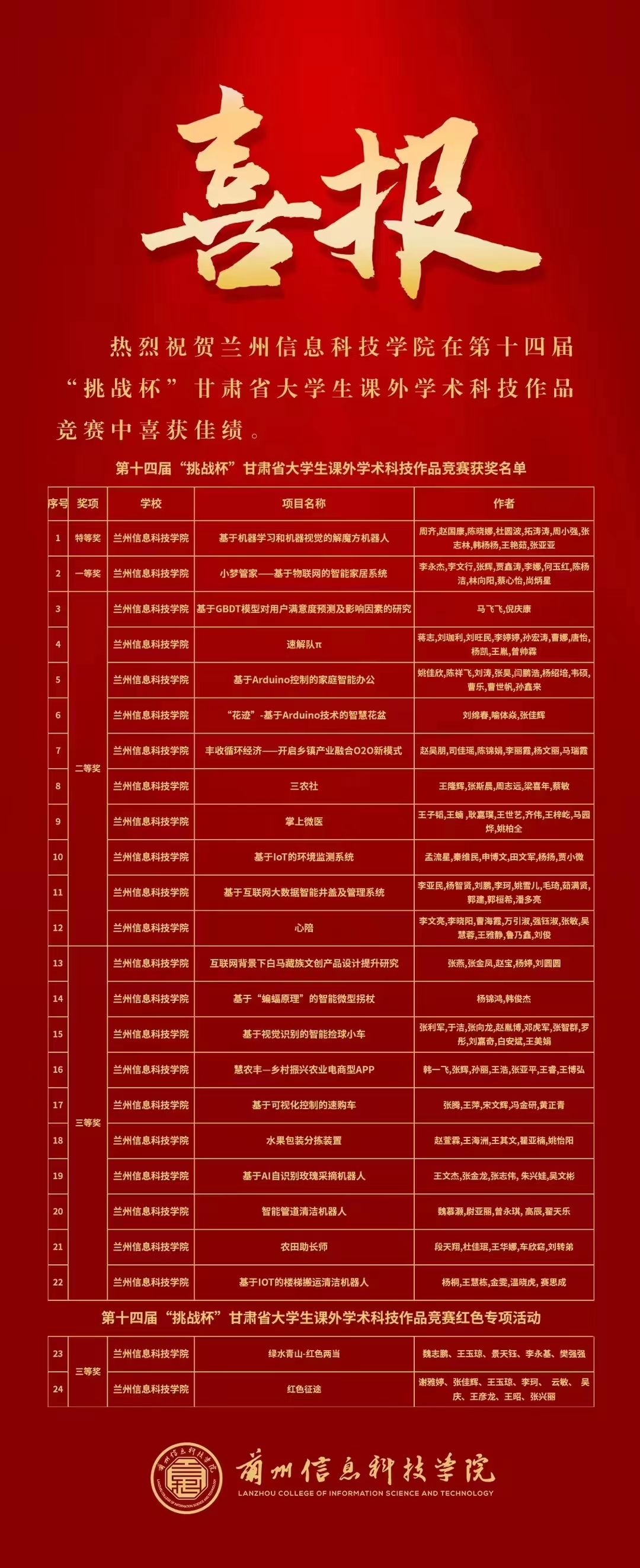 近日,第十四届“挑战杯”甘肃省大学生课外学术科技作品竞赛获奖名单公布,beat365官网唯一入口参赛的24件学生作品中,获得了特等奖1项、一等奖1项、二等奖10项、三等奖12项。其中,特等奖作品《基于机器学习和机器视觉的解魔方机器人》被推荐参加第十八届“挑战杯”全国大学生课外学术科技作品竞赛国赛。beat365官网唯一入口获评“优秀组织奖”。