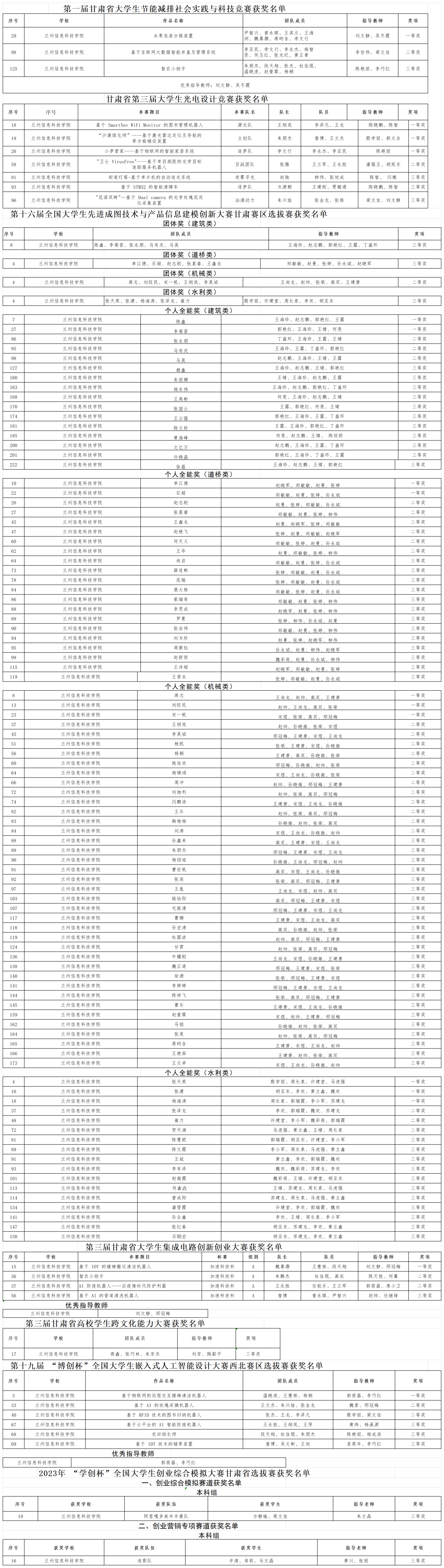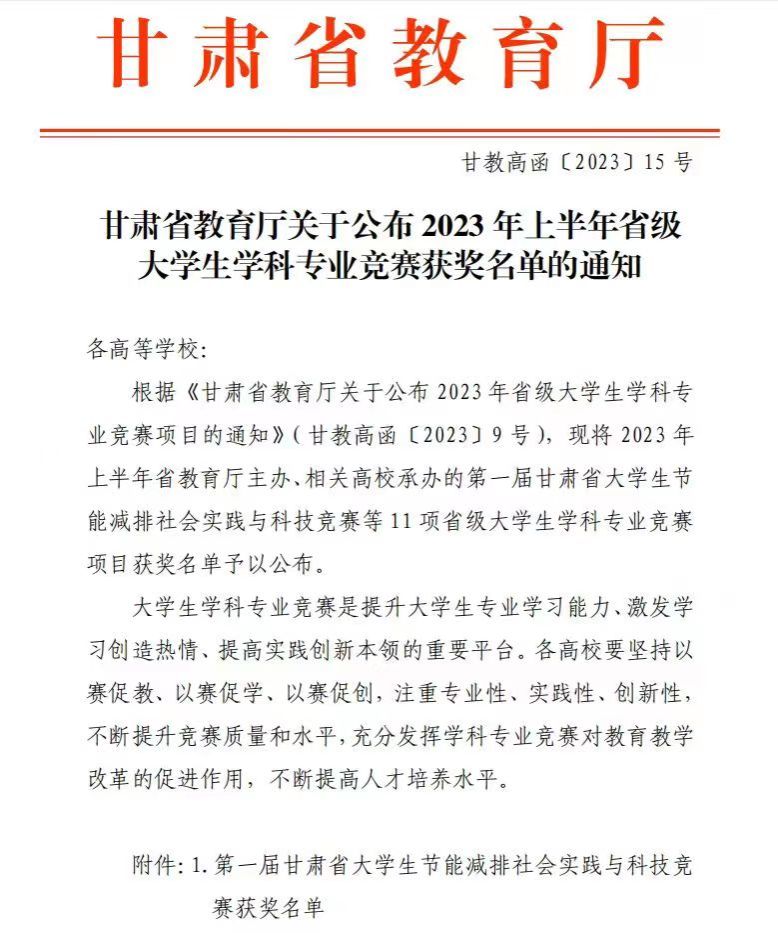 近日,2023年上半年由省教育厅主办的第一届甘肃省大学生节能减排社会实践与科技竞赛等11 项省级大学生学科专业竞赛项目获奖名单揭晓,beat365官网唯一入口获奖120项,5位老师被授予“优秀指导教师”荣誉称号,较2022年上半年获奖增加了23项,同比增长23.7%,同时,获奖数量超过全省同类院校获奖总数的71.9%以上。
