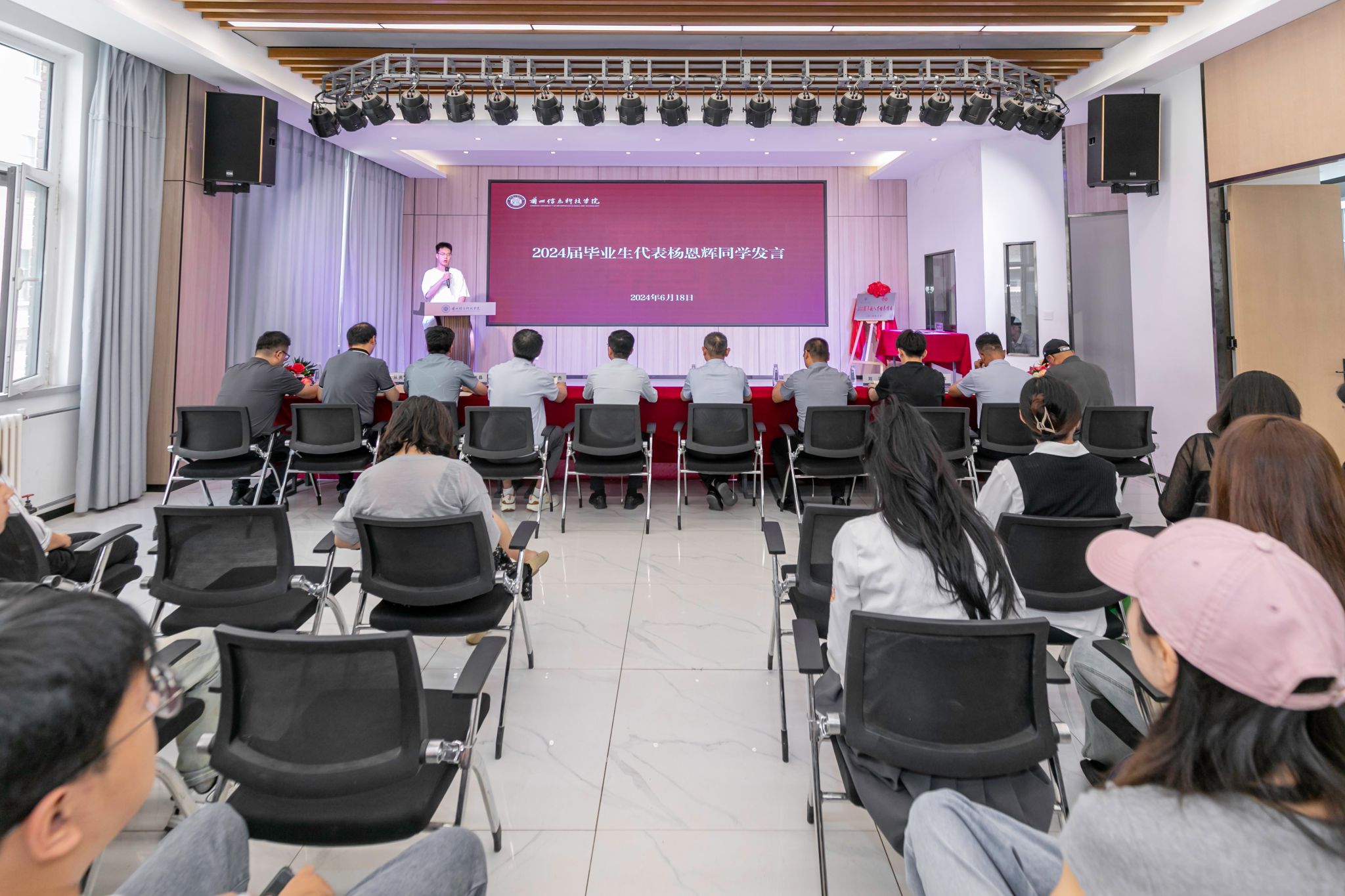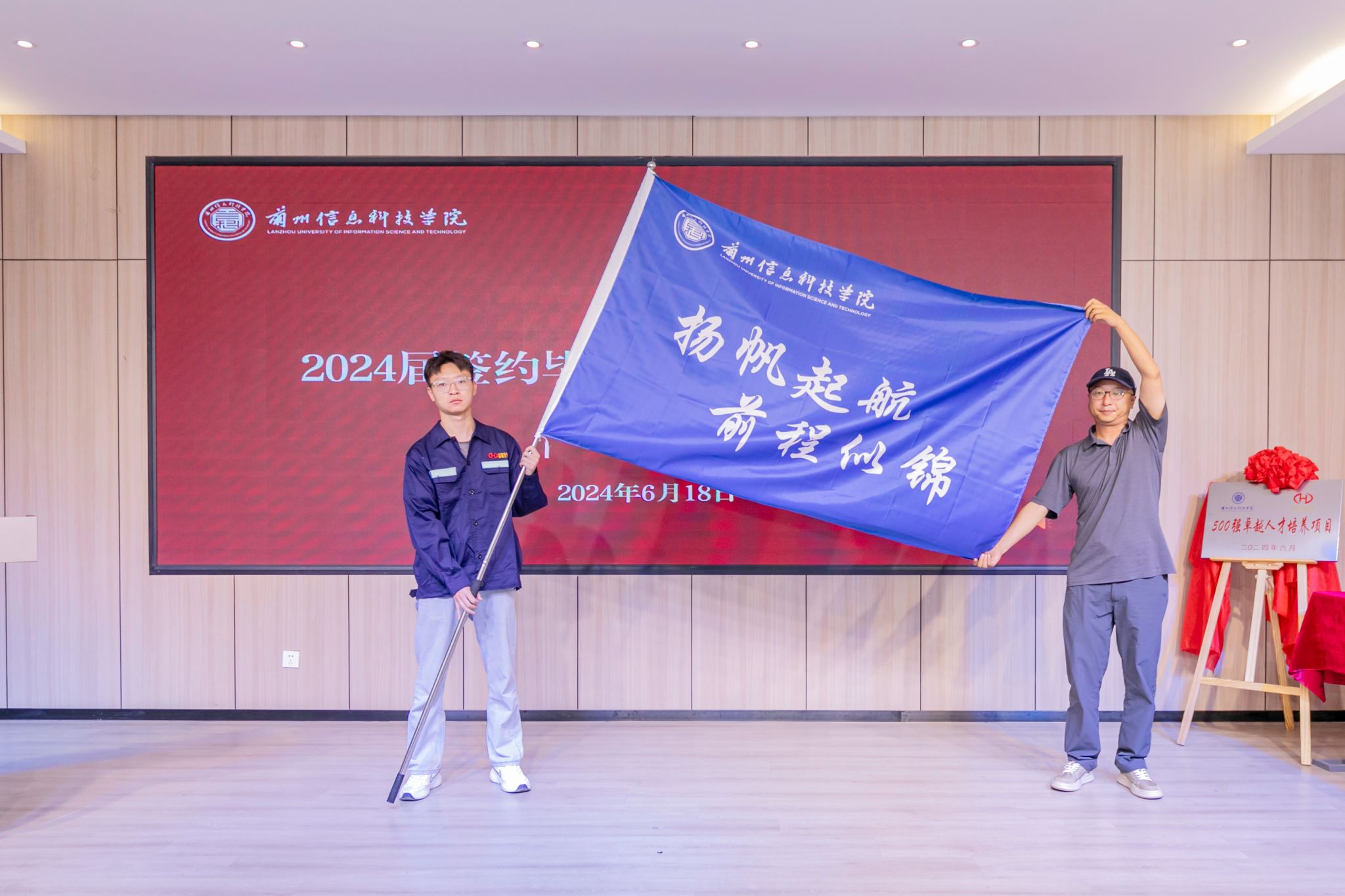 在欢送入职典礼环节,中核弘源公司人力资源中心人事主管钱常余、田莉为2024届签约学毕业生代表授“企业工作服”,人力资源中心经理刘宇为2024届签约毕业生代表“授旗”,新核实业公司综合业务部主任刘志杰向2024届签约毕业生致欢迎辞,满满的仪式感让参加典礼的师生看在眼里、暖在心里。