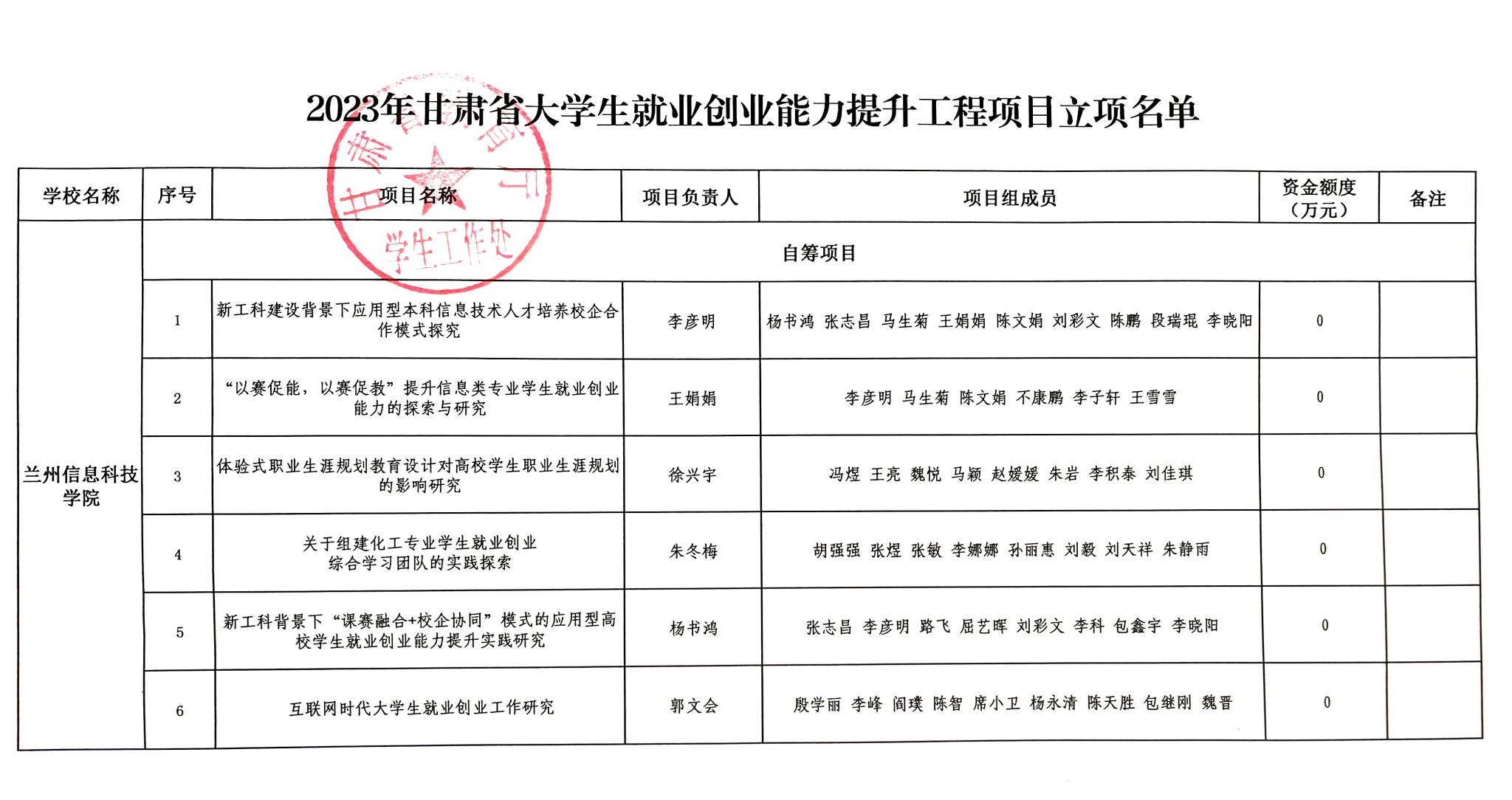 近日,甘肃省教育厅公布了《2023年甘肃省大学生就业创业能力提升工程项目名单》,beat365官网唯一入口《新工科建设背景下应用型本科信息技术人才培养校企合作模式探究》等6个自筹资金项目获批立项,学校就业创业工作取得新突破。
