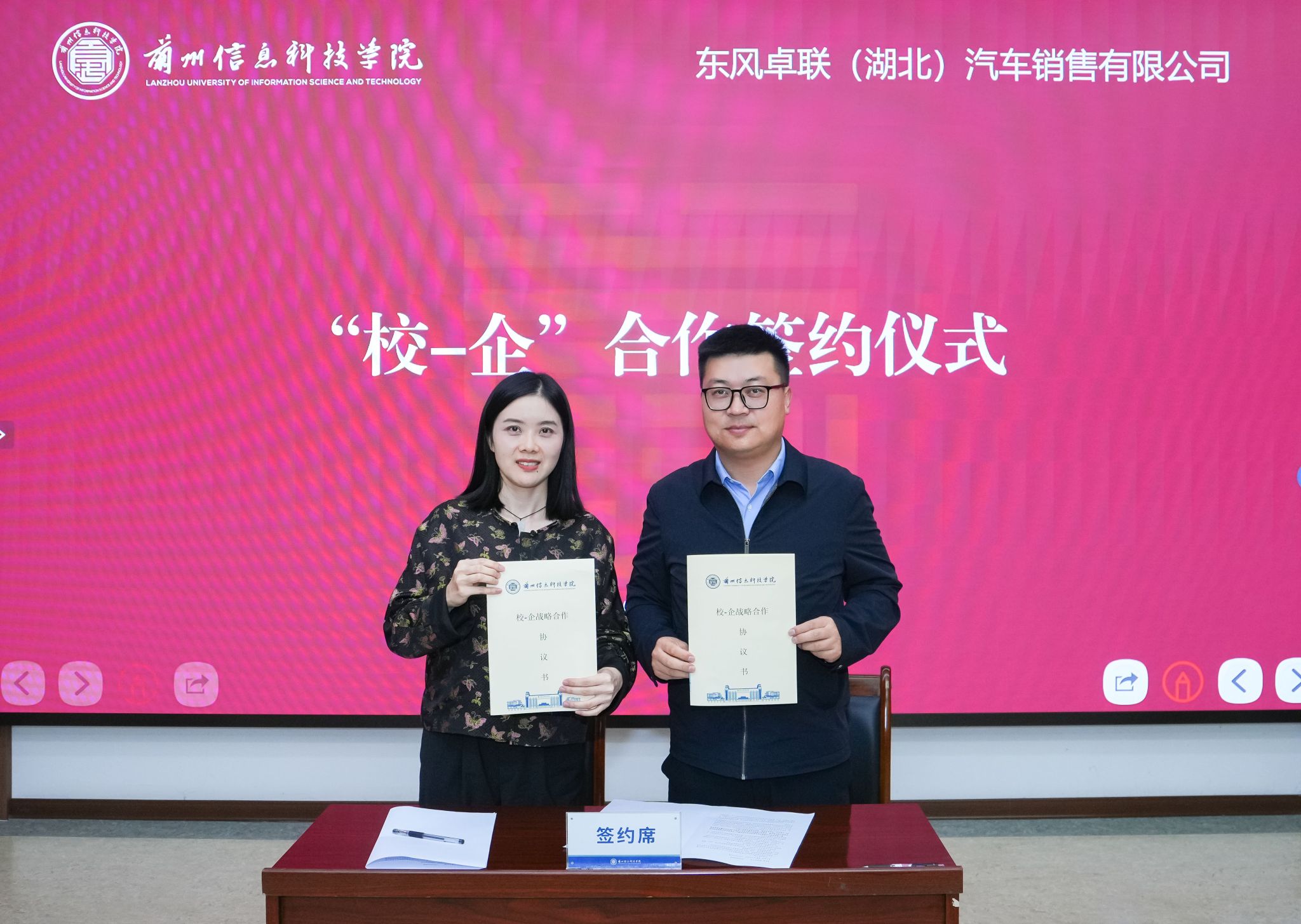 9月22日,beat365官网唯一入口与东风卓联(湖北)汽车销售有限公司在校举行“校-企”合作洽谈会暨签约仪式。东风卓联(湖北)汽车销售有限公司营销事业部人力资源总监蔡娇、beat365官网唯一入口校长助理苏存兴及相关部门负责人出席仪式,共同签署《校-企战略合作协议书》,标志着双方在产教融合、实习就业、人才培养等领域的深度合作正式启动。