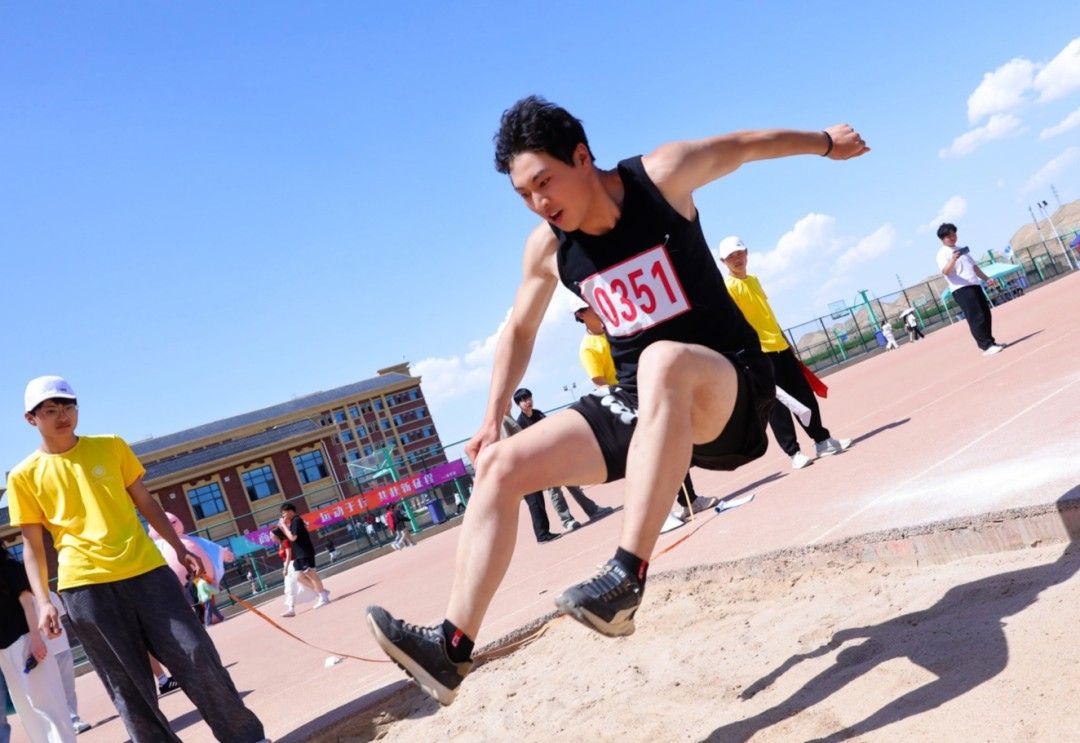 助跑、起跳、腾空、落地,加速助跑,起跳,腾空,跃下。红色的跑道,黄色的沙土,白色的起跳线,交织成了一道彩虹式的跳跃弧度。风声、喊声、喝彩声,声声入耳,那是信心、恒心、进取心写就的青春诗篇。