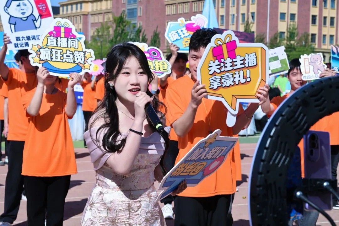 04 商学院,商”才卓越,智绘未来。手执向日葵,予绚烂、予希望,直播间里“早八”上架卖的飞起。他们用队形变换展现专业特色,财神爷、铠甲勇士穿梭其中,彩烟燃起,乘风破浪,向阳而生。