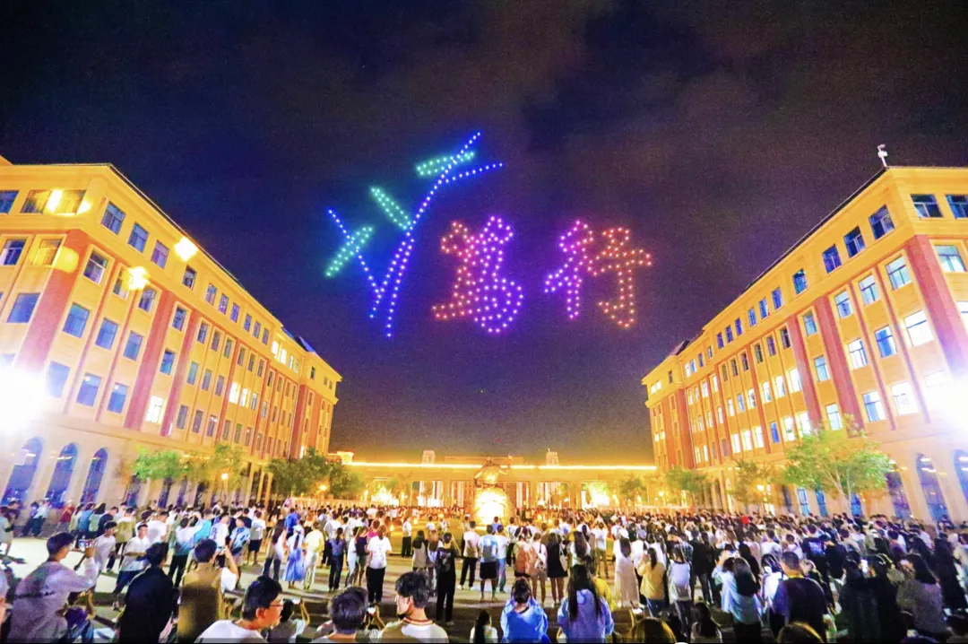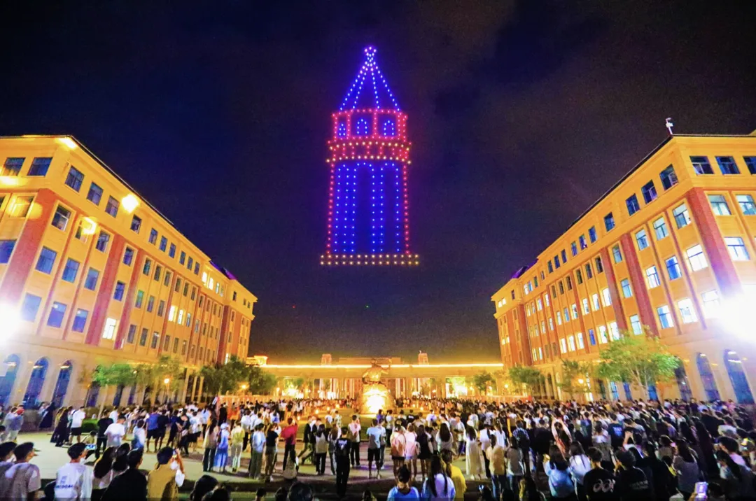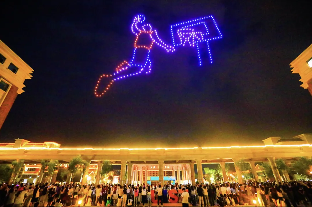 伴随着音乐的节点,300多架无人机腾空而起,犹如繁星点点,“跳”动在校园的上空,演绎着一场“空中舞蹈”,快速变幻的“骆驼沙漠”“梦想塔”,“学校logo”“智慧树教学楼”等图案,给新到的大学生带来了别具一格的精彩体验。