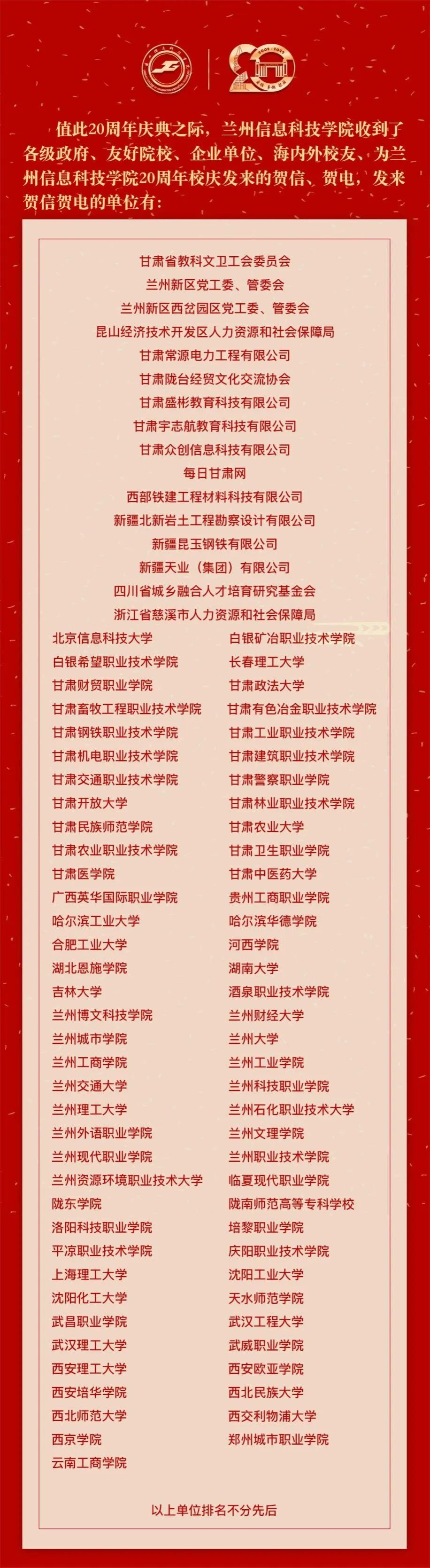 为党育人,为国育才;铮铮誓言,铭刻心中;星霜荏苒,初心如磐;廿年正青春,奋进再起航;牢记立德树人根本任务;以坚定信念赓续育人使命;双秩如歌,时节如流;峥嵘岁月,矢志树人;栉风沐雨,桃李芬芳;春华秋实,薪火传承;二十载守正创新,始终坚持走特色鲜明和内涵发展之路;二十载开拓进取,始终立足甘肃,服务国家和地方经济社会发展。