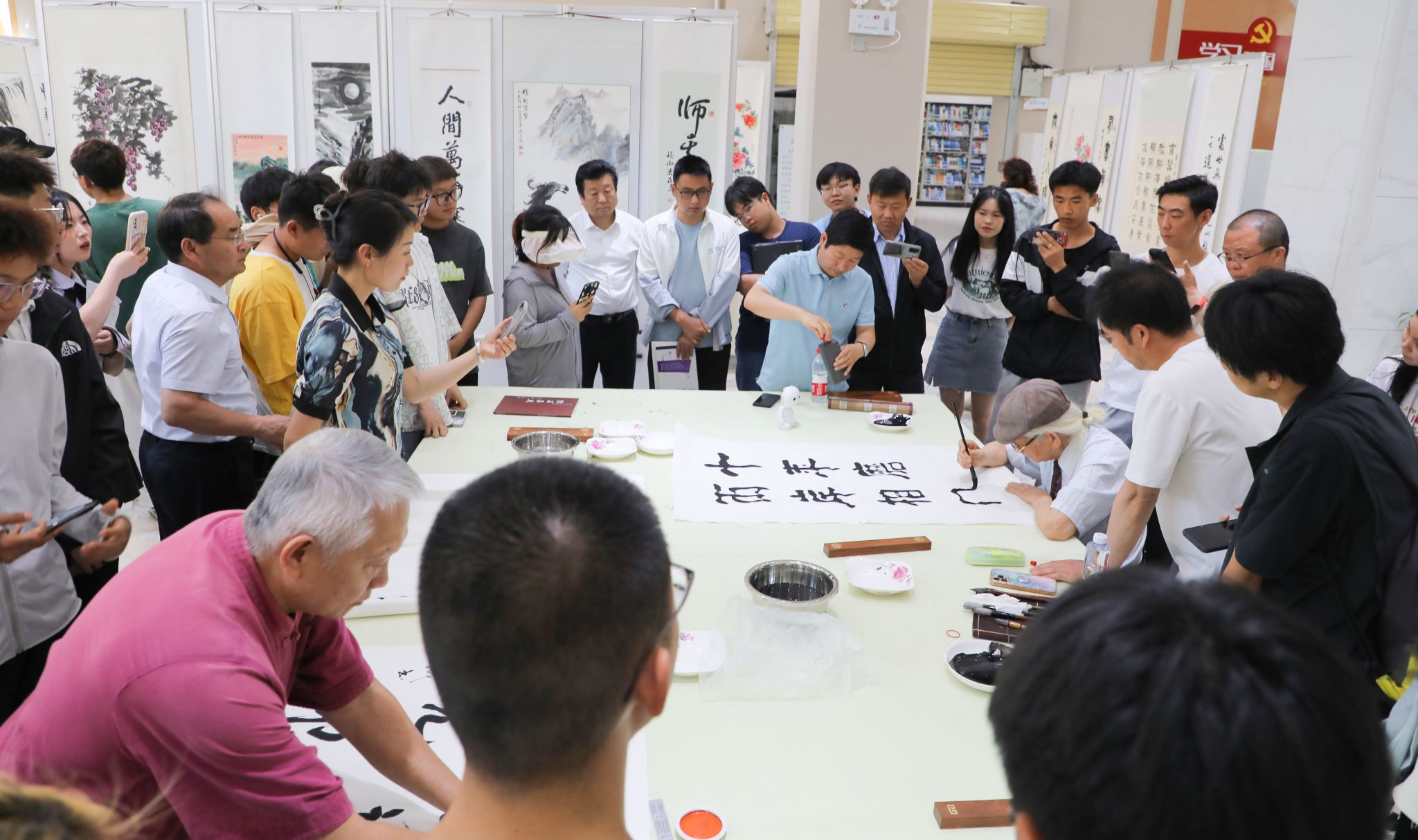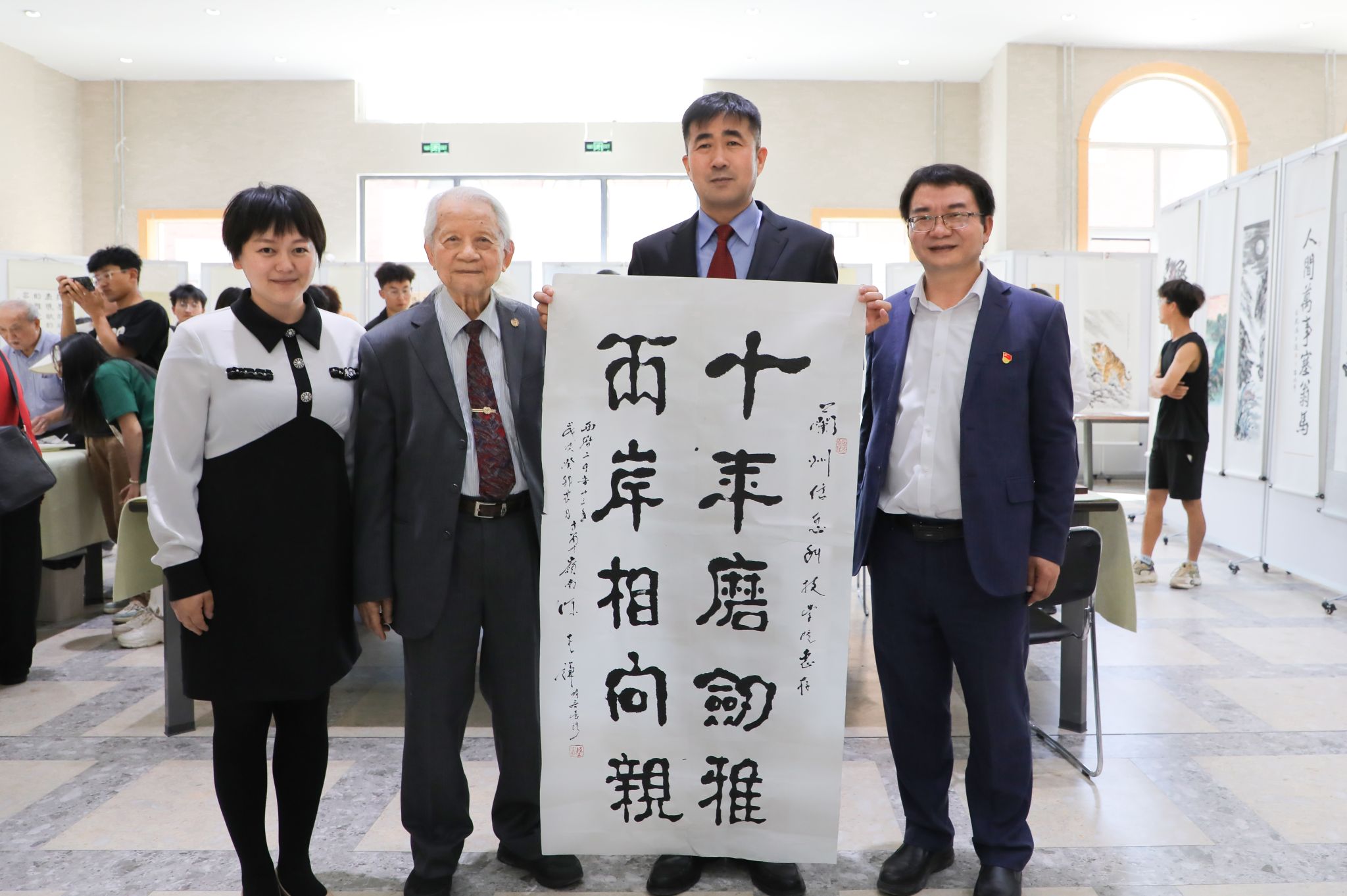 活动现场,百余幅优秀书画作品集中展示的同时,更有书画名家现场指点。来自两岸的十多名书画名人泼墨挥毫、舞动丹青进行书画创作,一幅幅书法作品笔酣墨饱,力透纸背,片纸余墨,尽现赤子之心。师生们围聚一起,通过书画文化交流互鉴、心灵互通共融,近距离感受着书画艺术的独特魅力,探索两岸书画艺术发展和共同的历史文化遗产,进一步增强了民族认同感、自豪感和归属感。