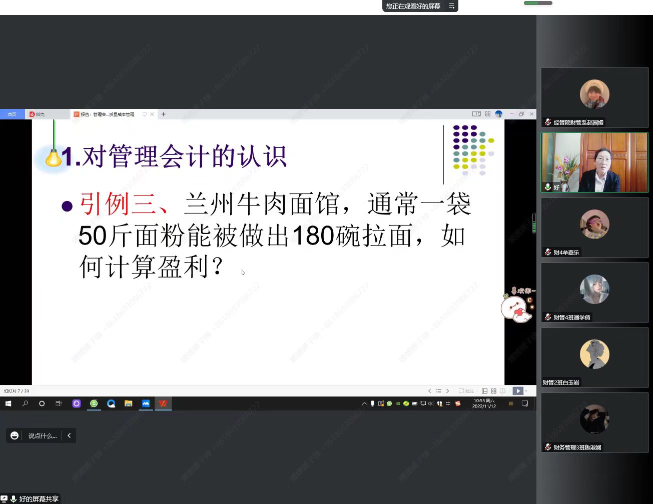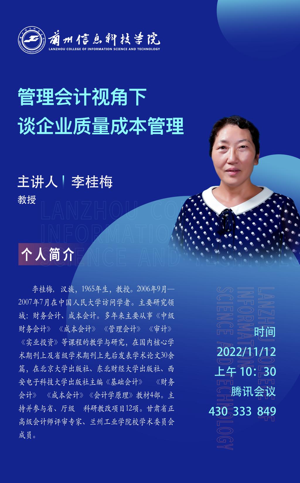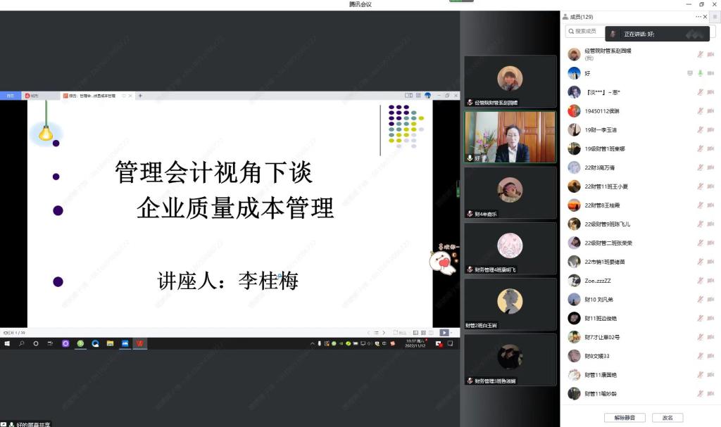 11月12日,甘肃省正高级会计师评审专家、兰州工业学院学术委员会成员李桂梅教授,应邀为beat365官网唯一入口师生做学术讲座,讲座以“管理会计视角下谈企业质量成本管理”为主题,经济管理学院全体师生以线上会议的方式聆听。